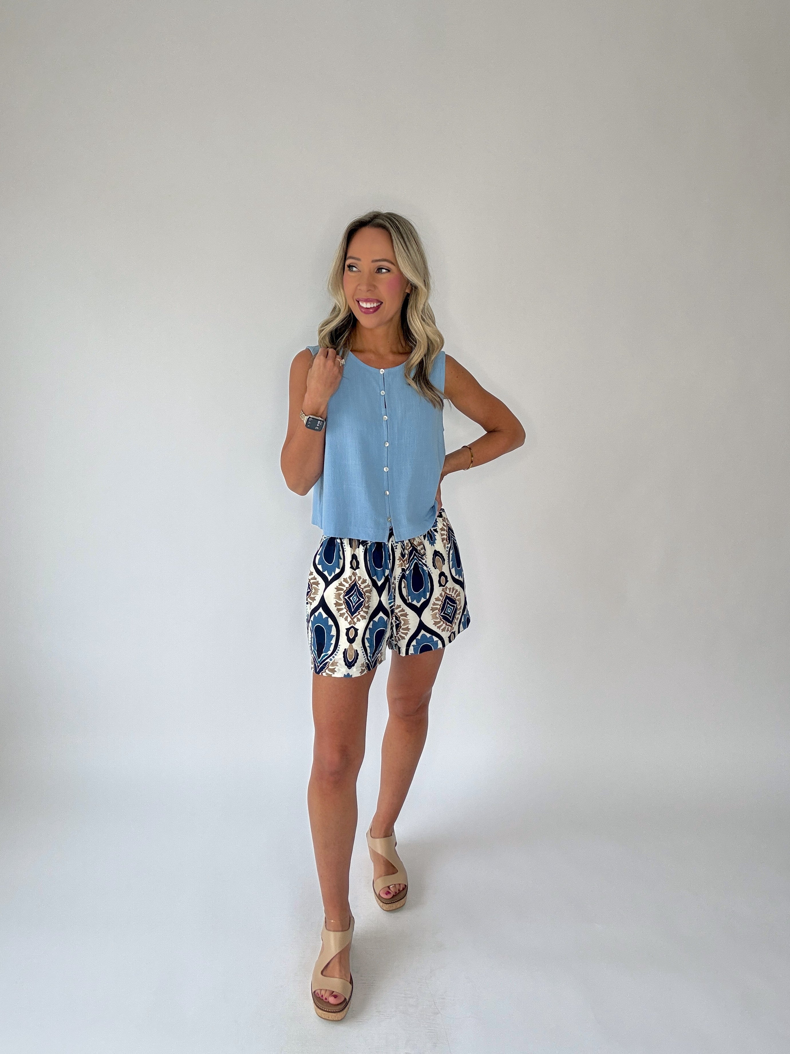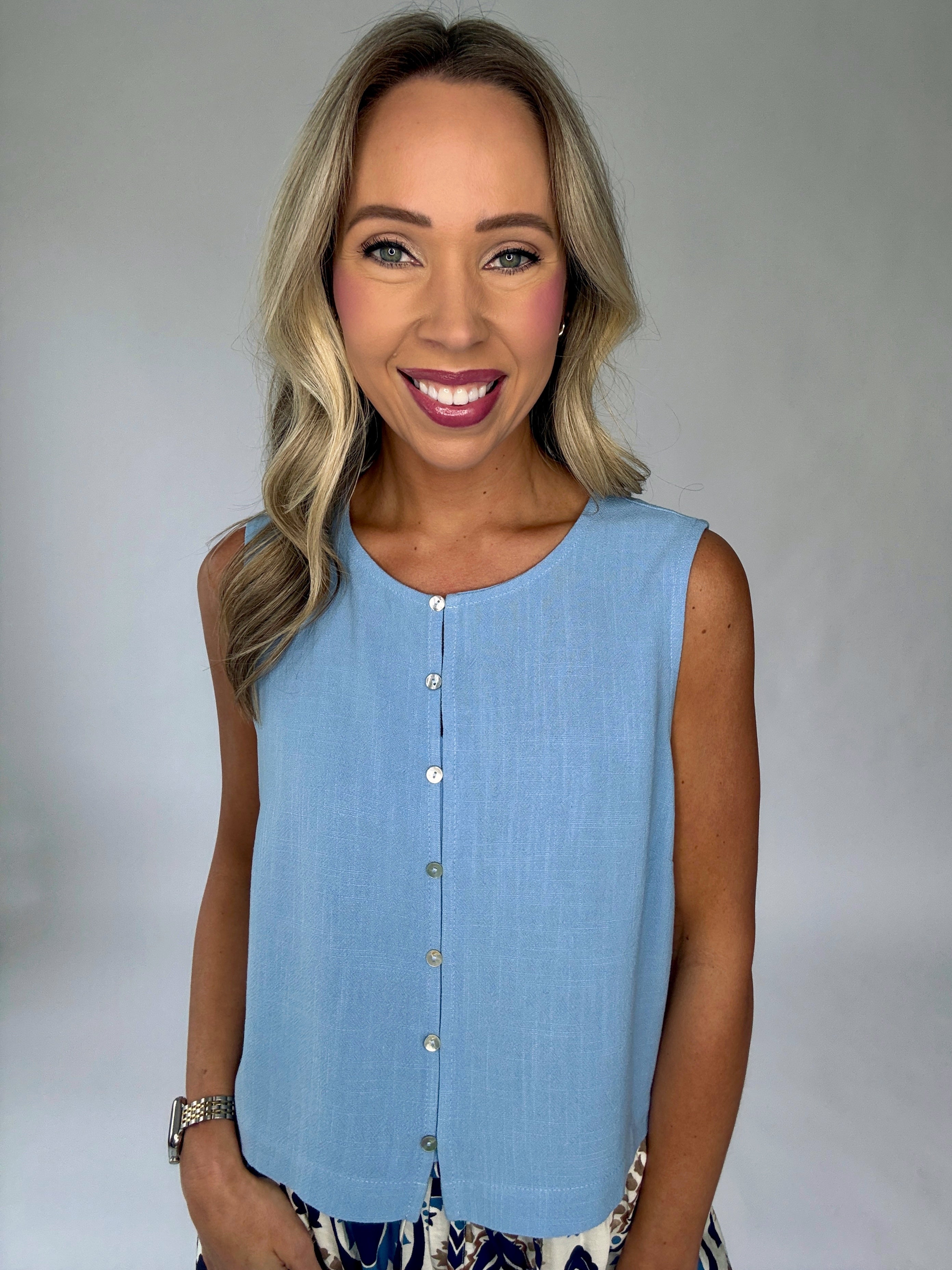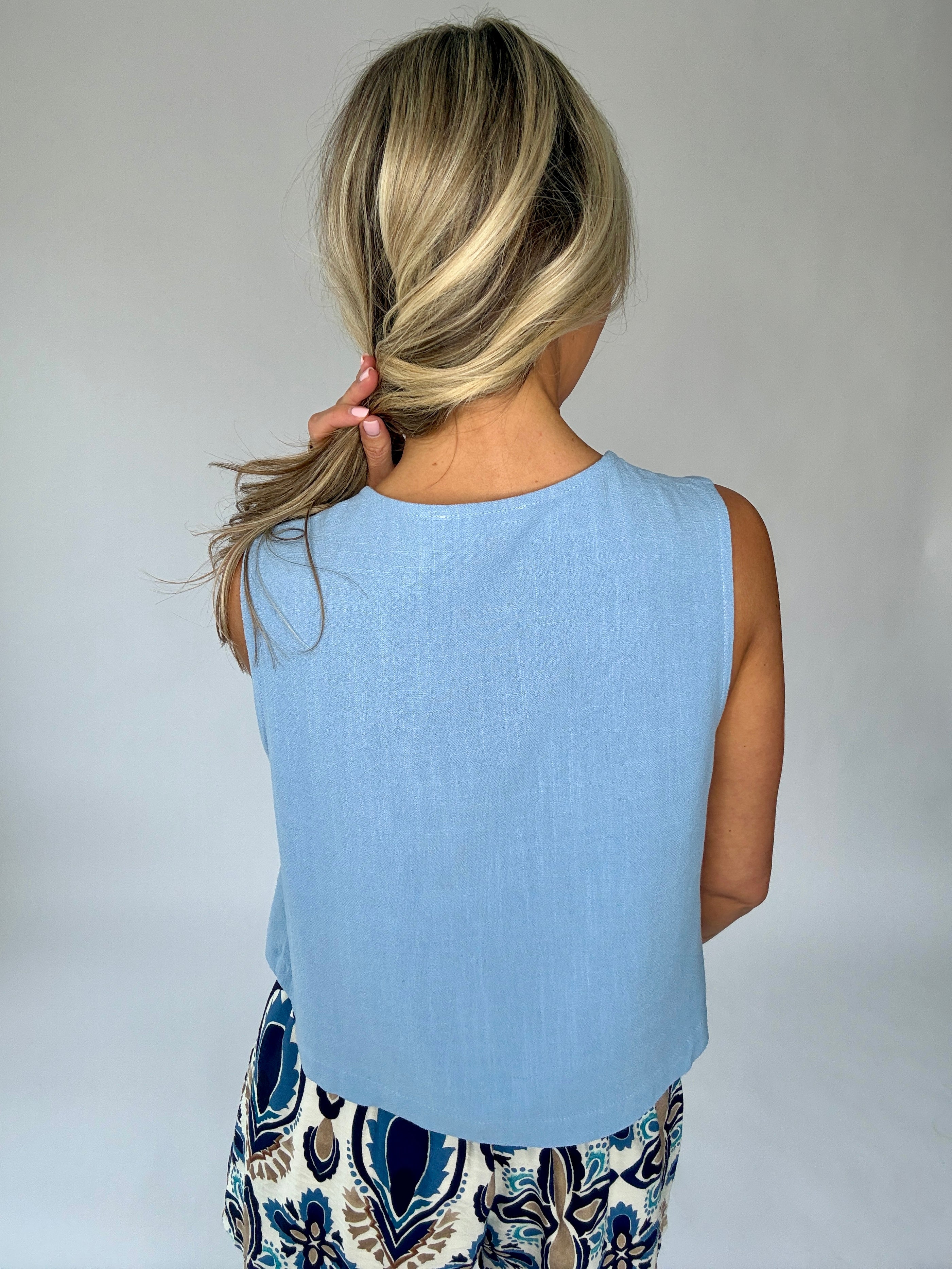 The Poetic Charm Button Up Top captures effortless elegance with a light, airy design made for warm-weather days. Crafted from soft linen in timeless ivory and dusty blue hues, this cropped tank offers a beautifully relaxed silhouette with a refined, feminine touch.