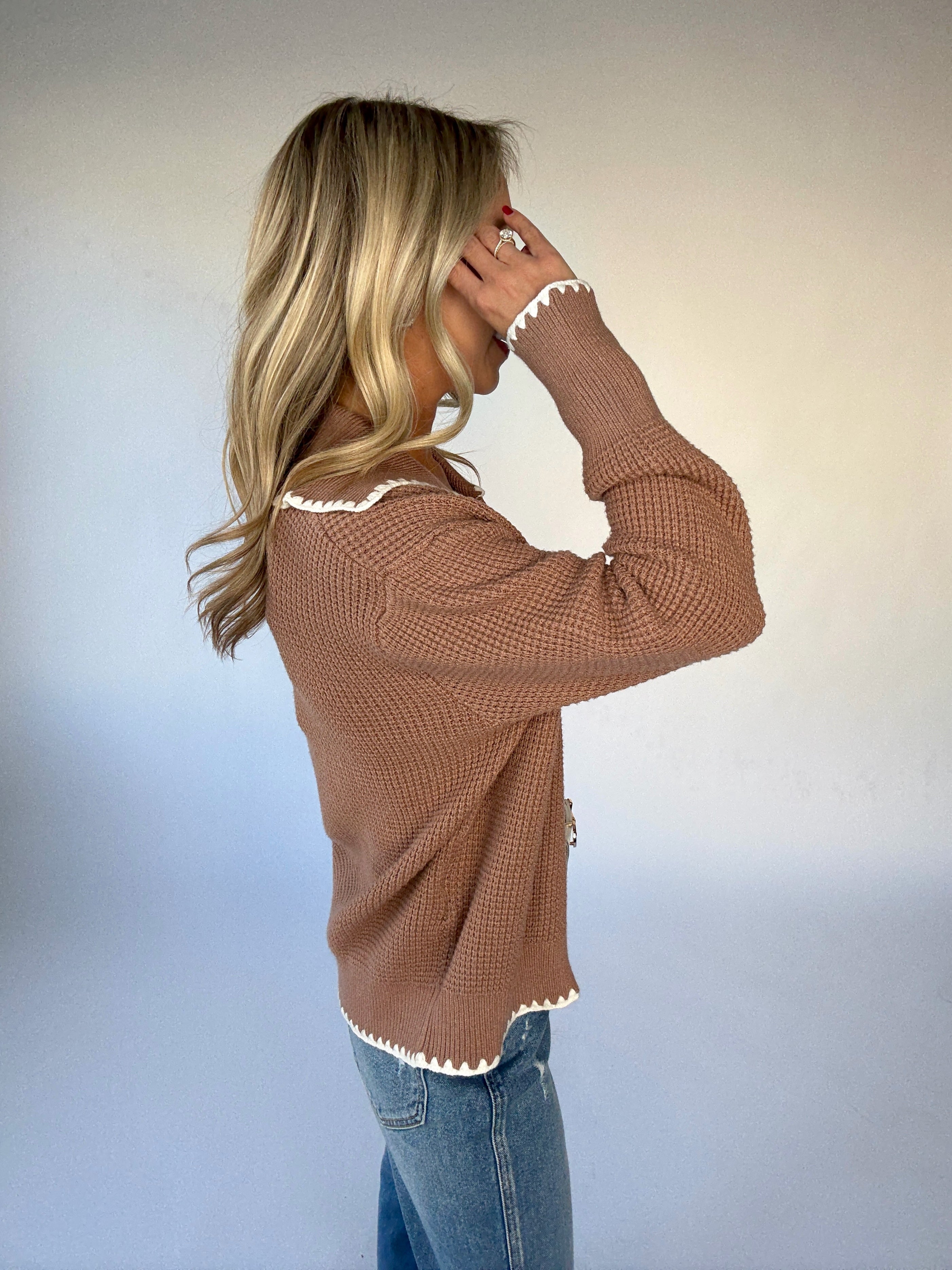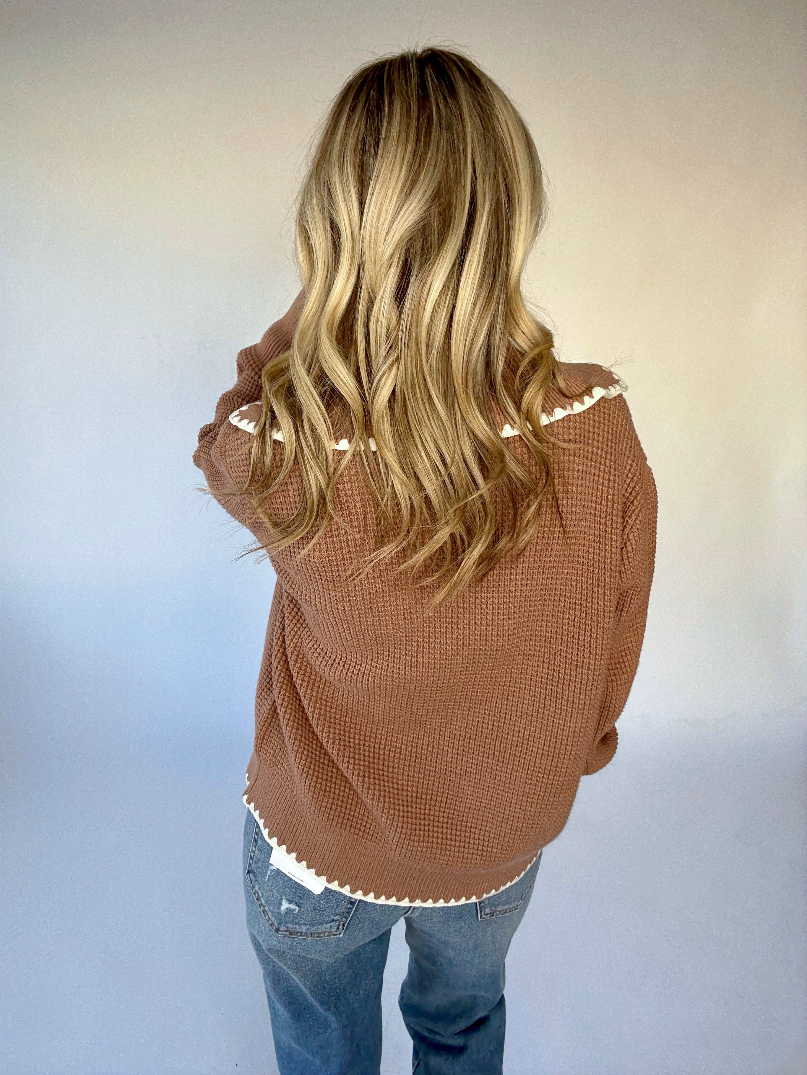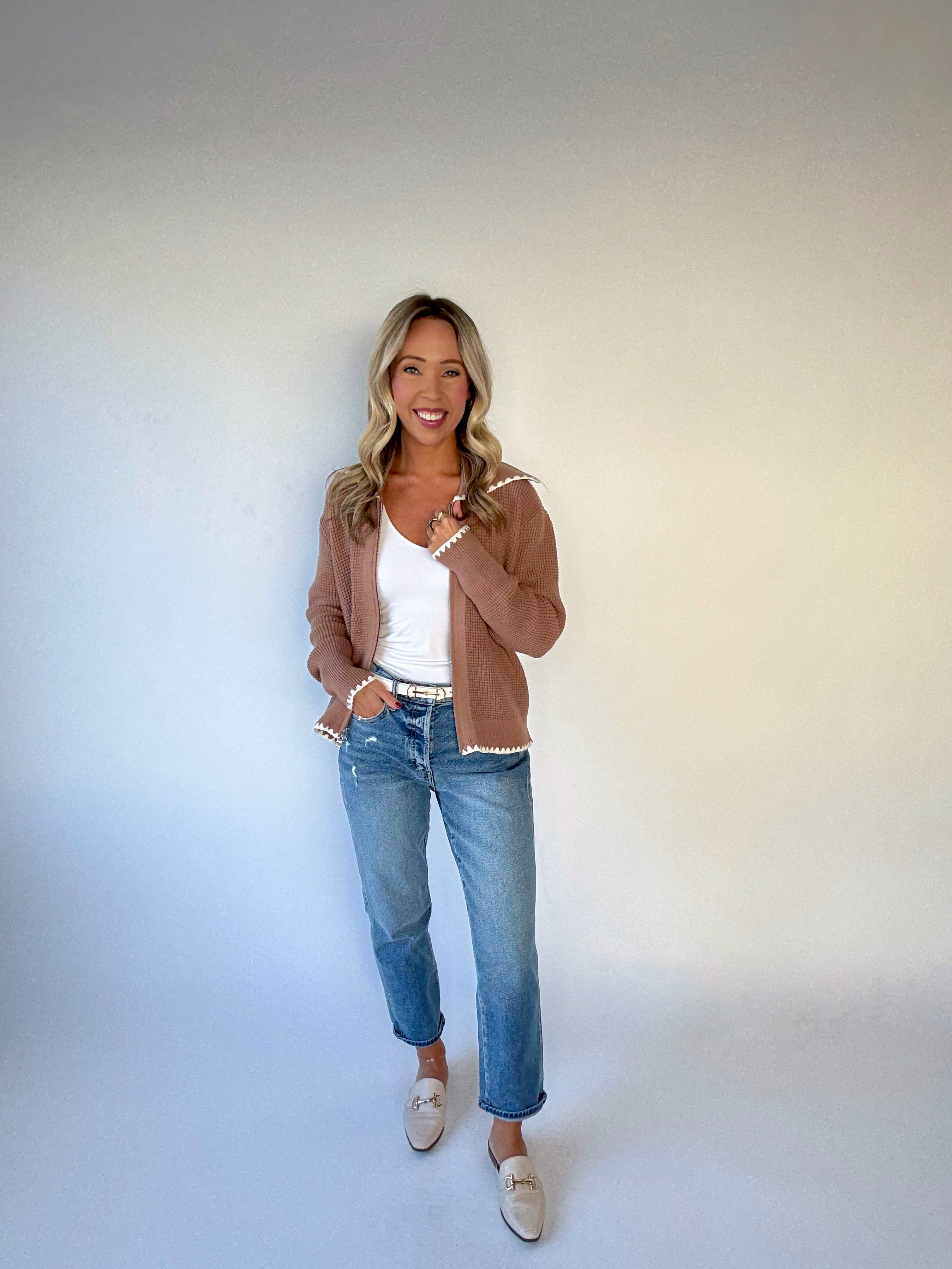 With a contemporary waffle stitch design and scalloped edging, this zip-through knit is a chic day-to-night option.