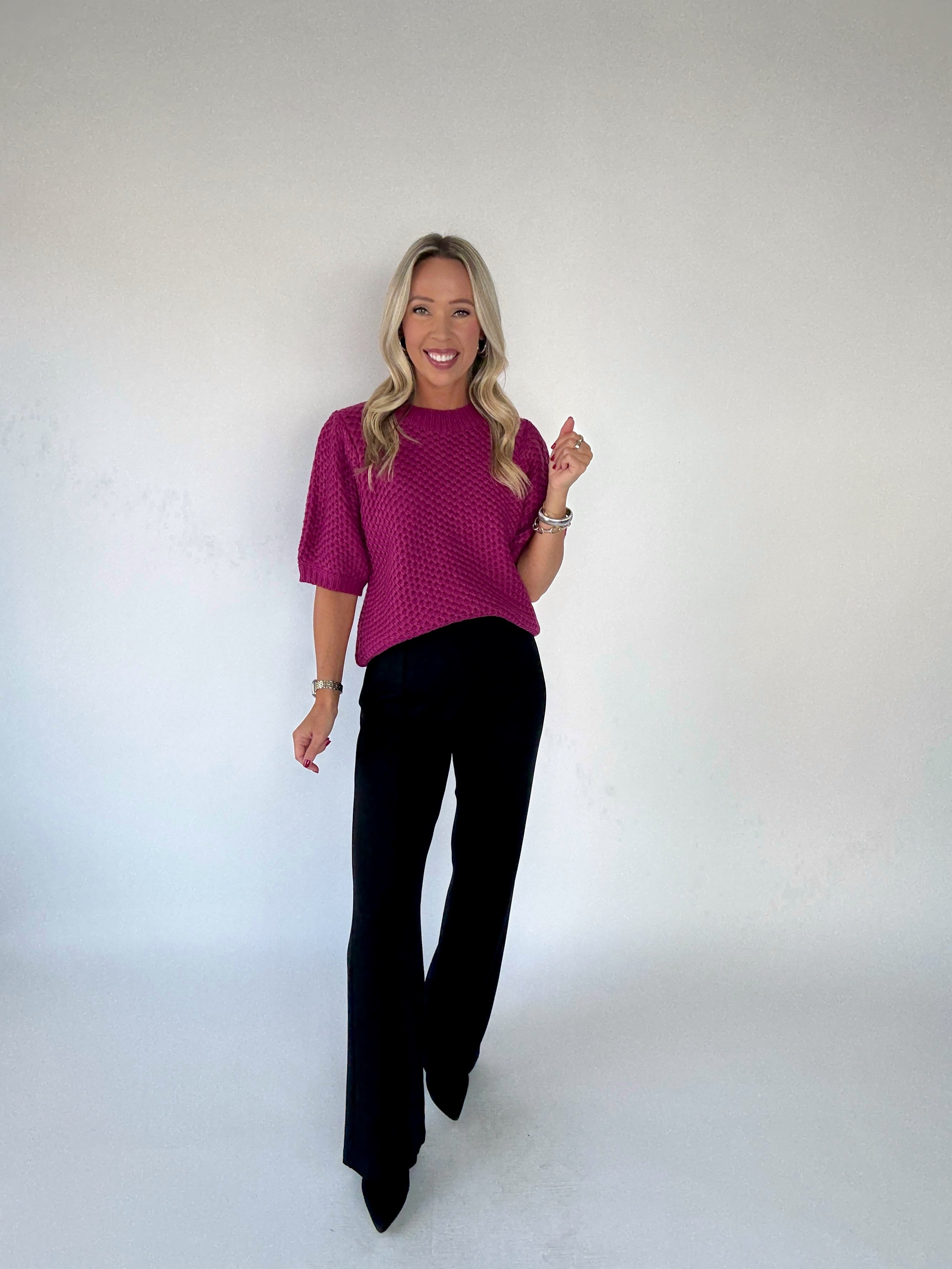 Brighten your wardrobe with the Berry Bliss Open Knit Sweater, a modern take on cozy sophistication. Crafted in a chunky open knit, this sweater features short balloon sleeves for a playful yet refined silhouette. Its flattering slim fit makes it true to size, while the vibrant berry hue adds a bold pop of color that complements every skin tone.