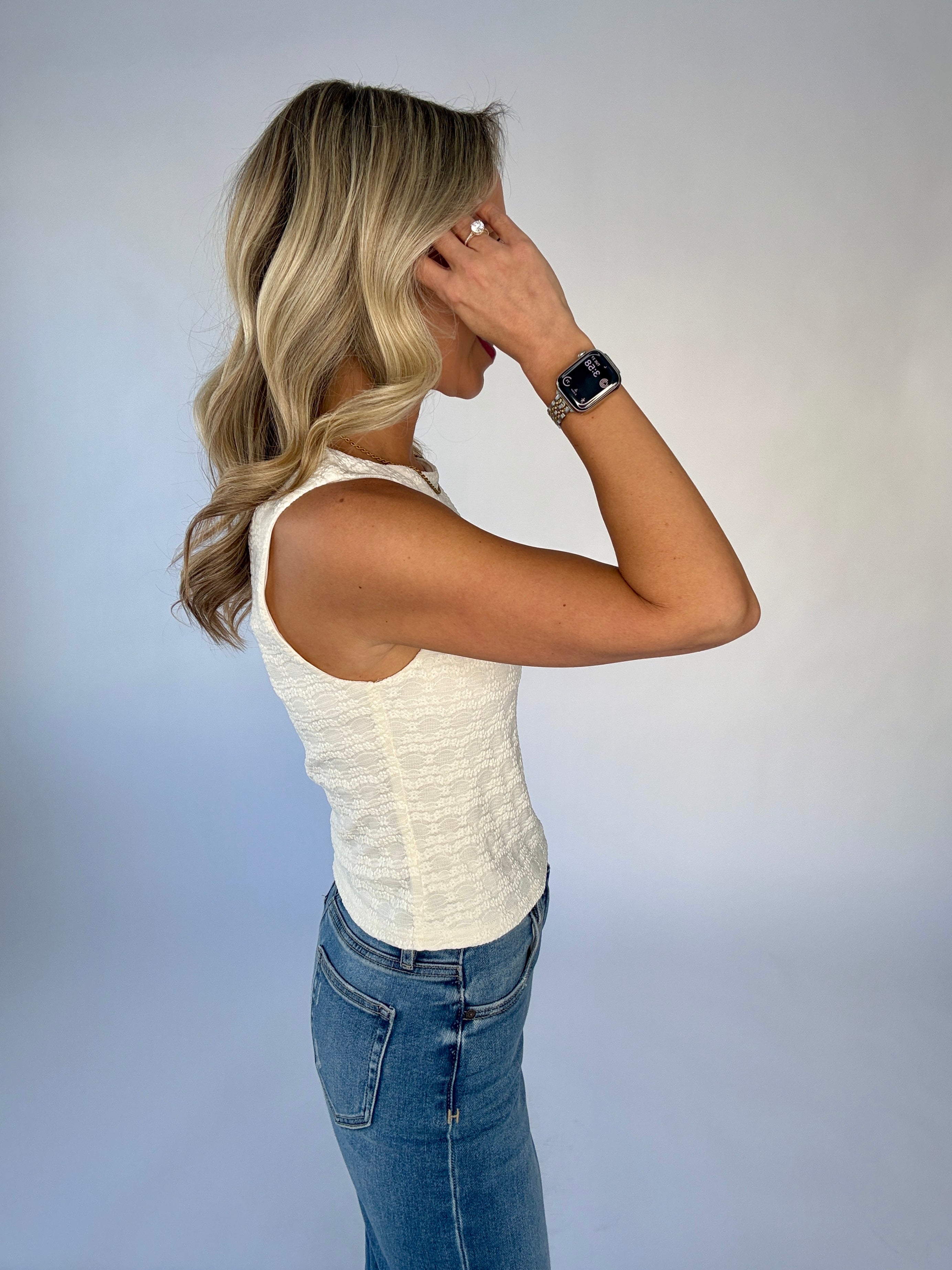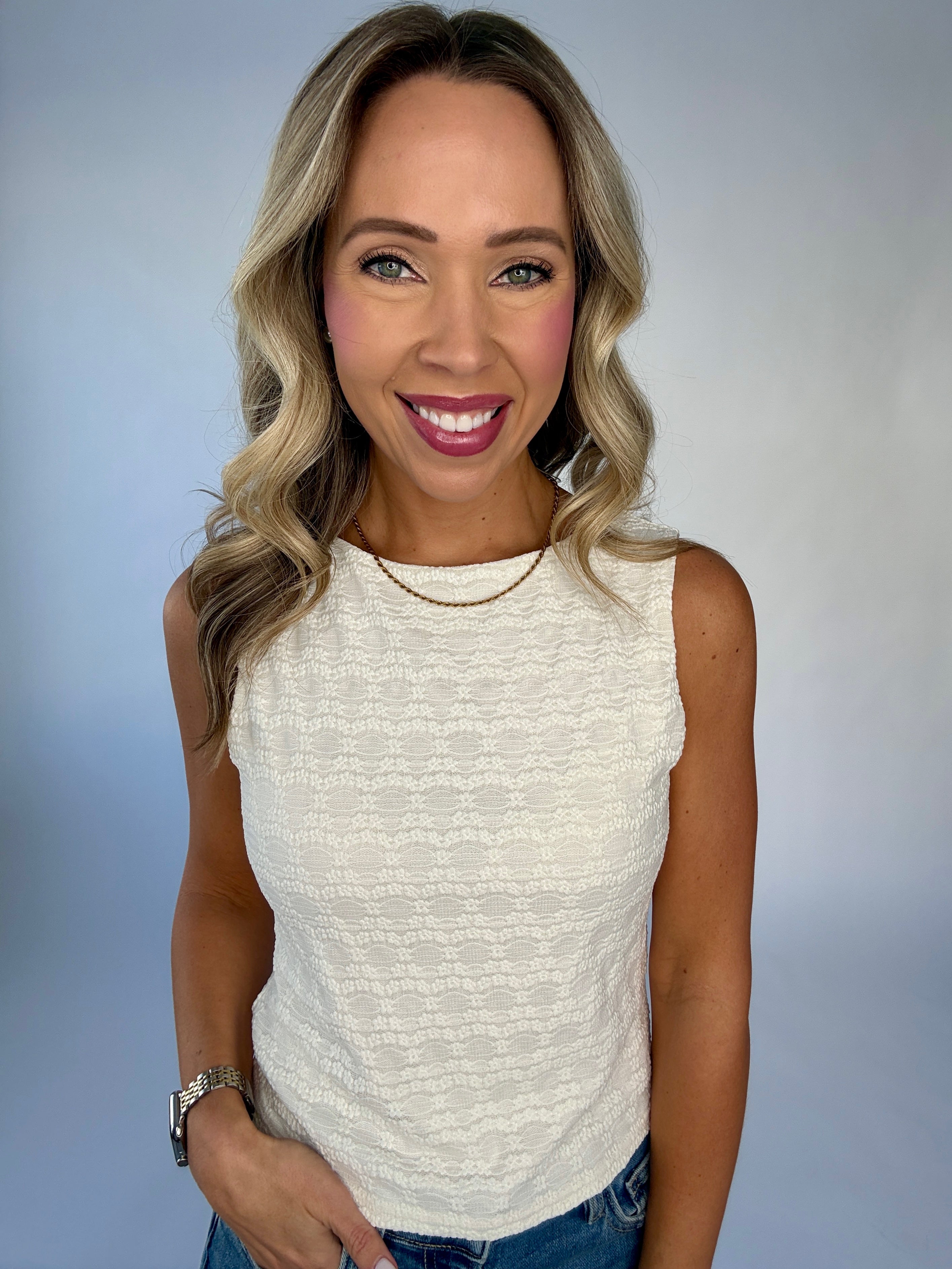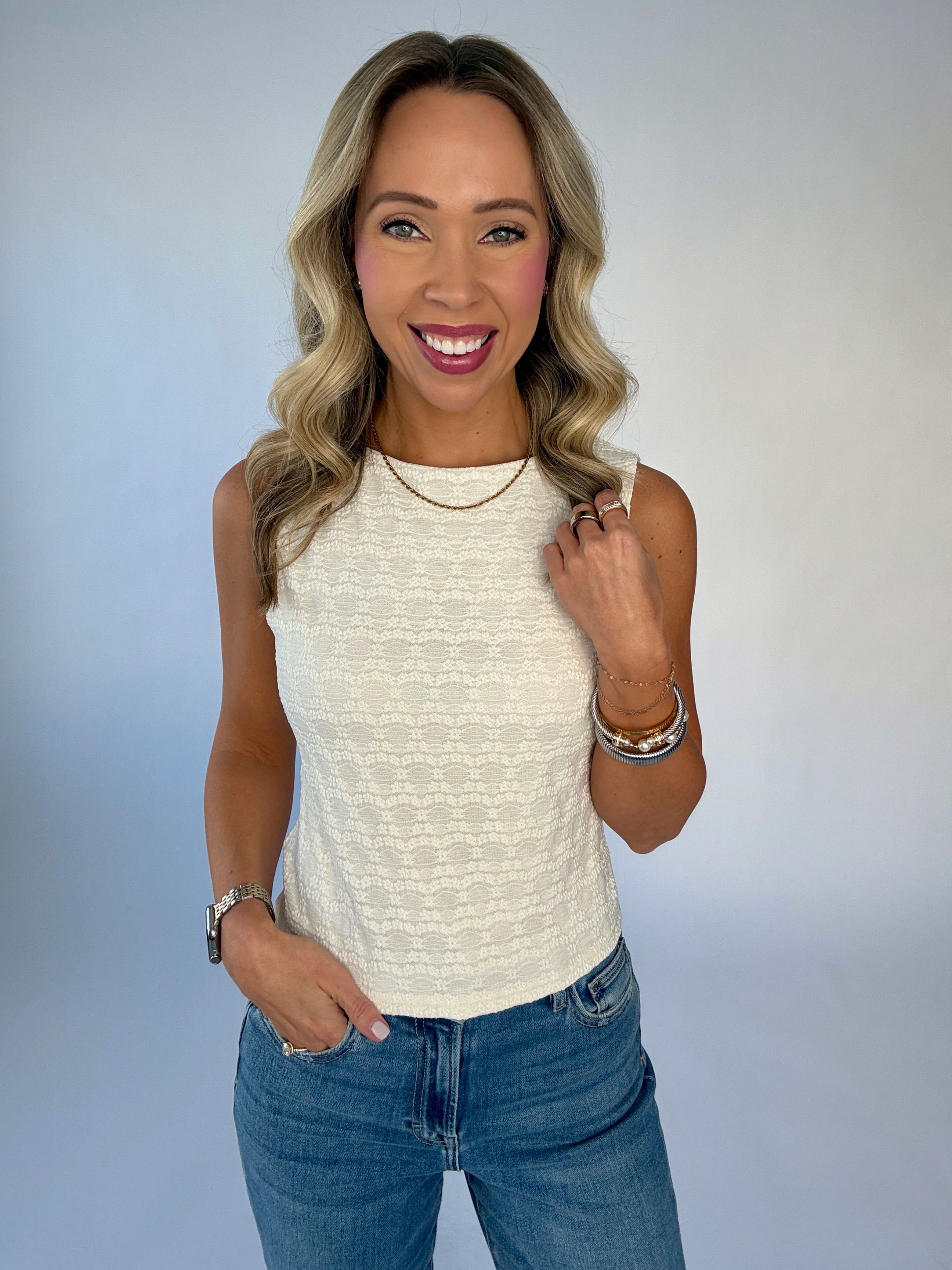 The Café Crème Top is a refined expression of effortless elegance, designed to bring subtle romance to everyday dressing. Crafted in crisp off-white floral jacquard, this sleeveless top features delicate blossom detailing woven throughout the fabric for a beautifully textured, tonal finish.