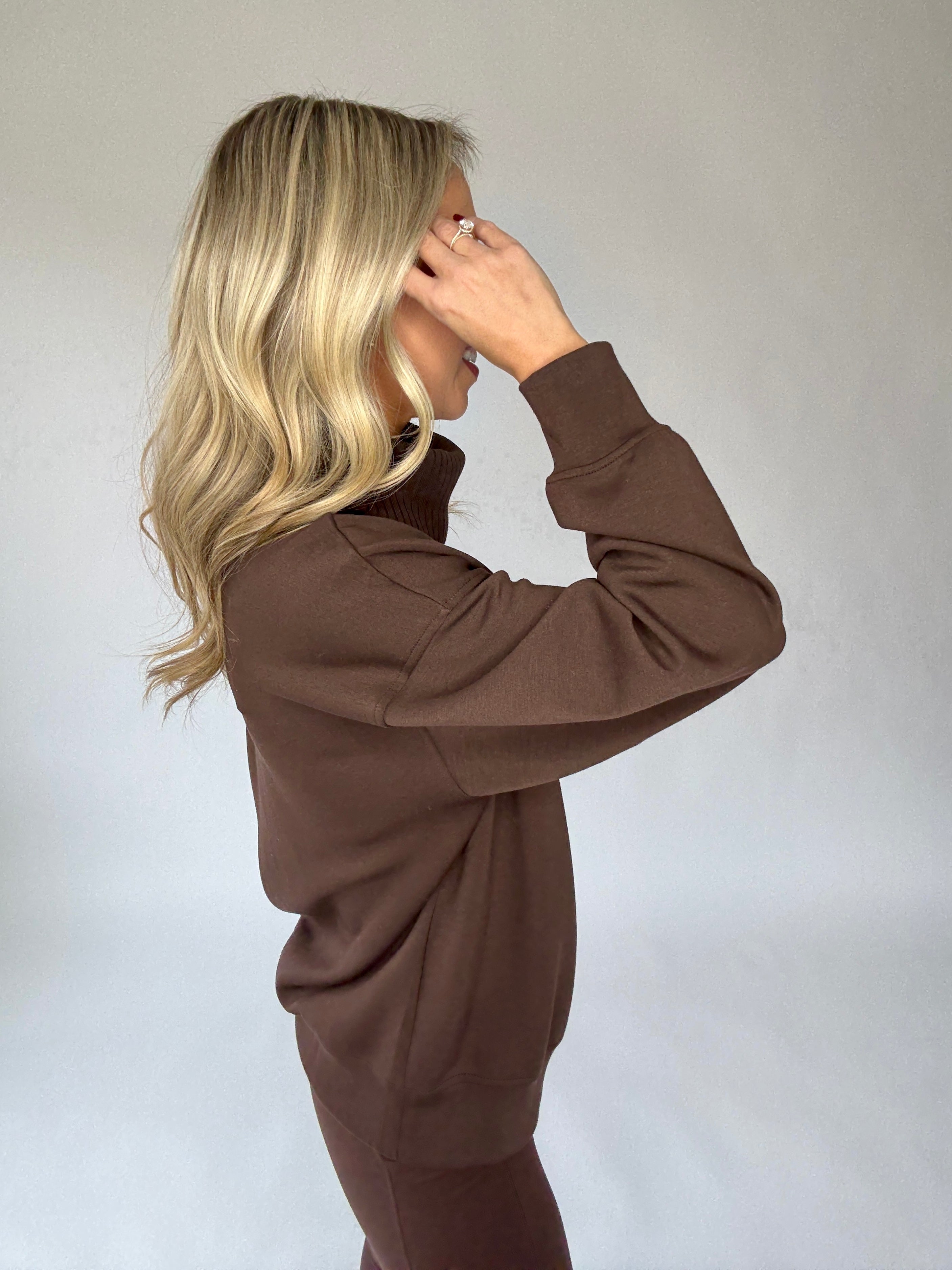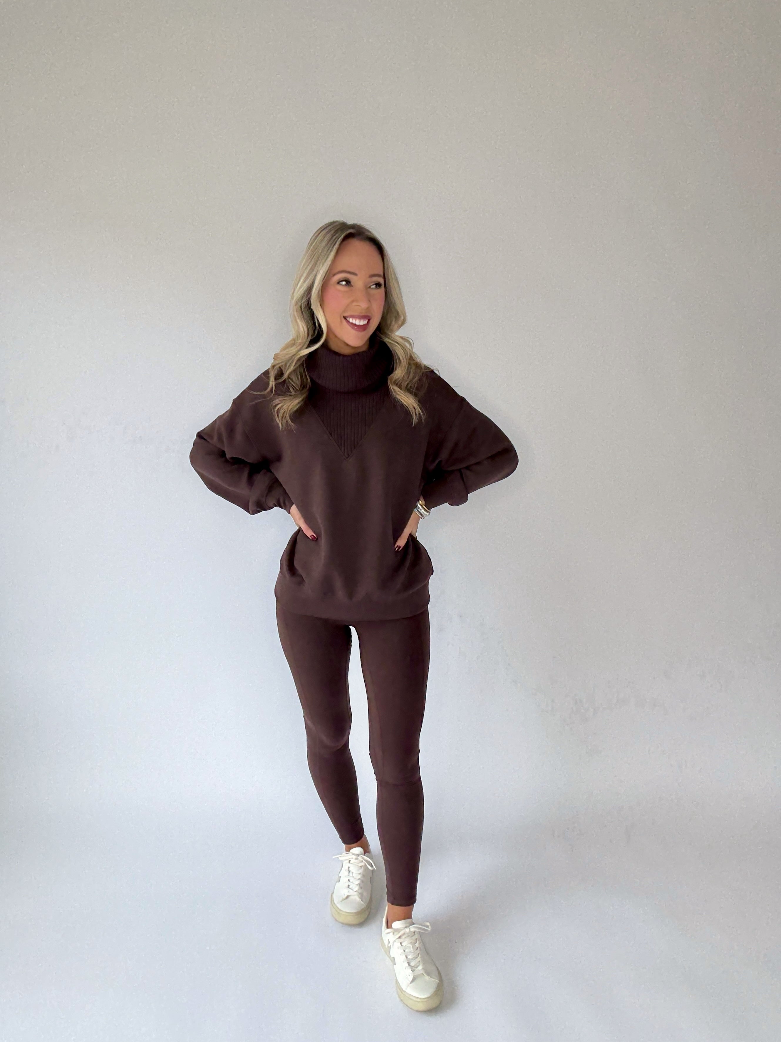 Elevate your everyday comfort with the Cocoa Comfort Turtle Neck Pullover, a refined essential crafted in a rich, dark espresso hue. Designed with a sophisticated ribbed contrast V-detail that seamlessly leads into the cozy turtle neck, this pullover blends timeless structure with modern elegance.